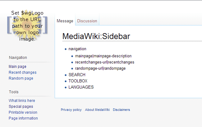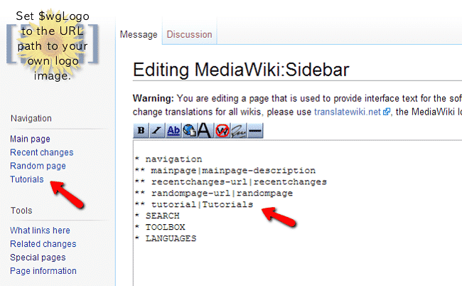 You can easily change the MediaWiki sidebar to meet your needs. To change the links, search for the following phrase in the search bar: