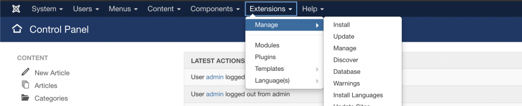 Once you have the theme on your local device, access the Administrative area of your website. From there, navigate to Extensions at the top menu, click on it, then select Manage -> Install: