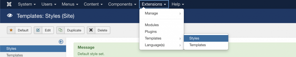 Once the template has been installed, to switch the default template of the website to the new one, navigate to Extensions -> Templates -> Styles: