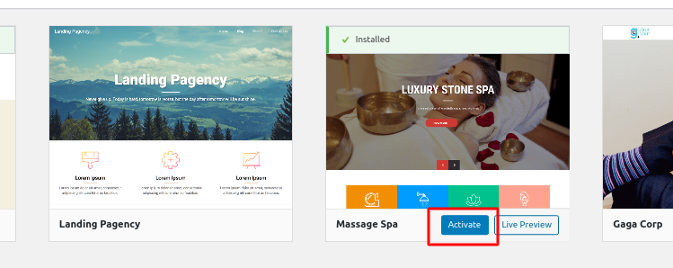 In order to install a theme, hover over the theme and click on “Install”, after that you will have to click on “Activate” so the theme can become active on your website: