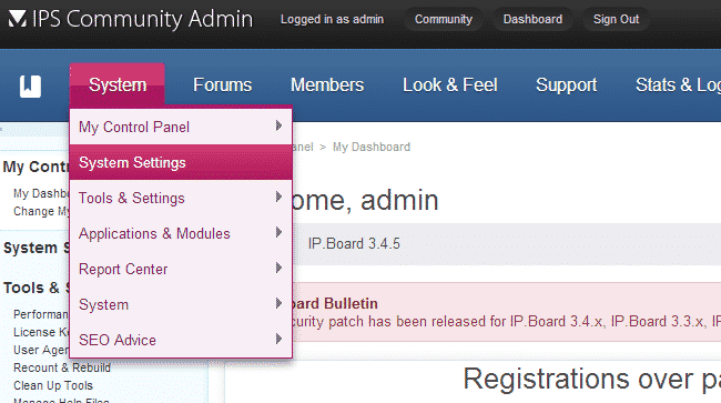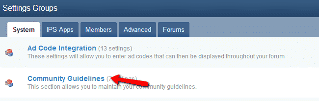 In this tutorial you are going to learn how to setup the registration rules/guidelines, terms and privacy policy. To setup those for your IPB, login to the admin area and navigate to “System” > “System Settings”: