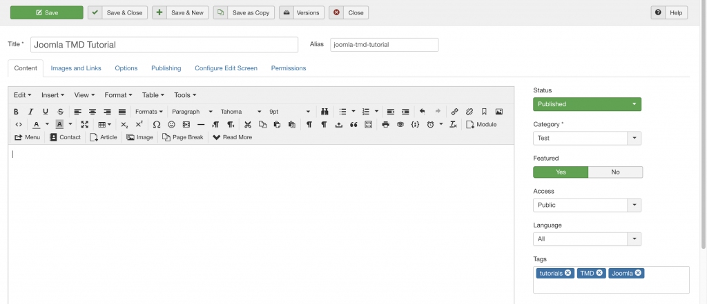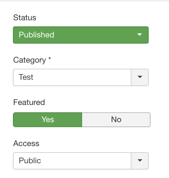 - To avoid visitors viewing an unfinished Article while it is still being created, you can leave “Featured” to “No”, or temporarily change “Access” only to “Super Users”. You can later return to the “Content” tab to revert those changes and make the Article publicly accessible.
