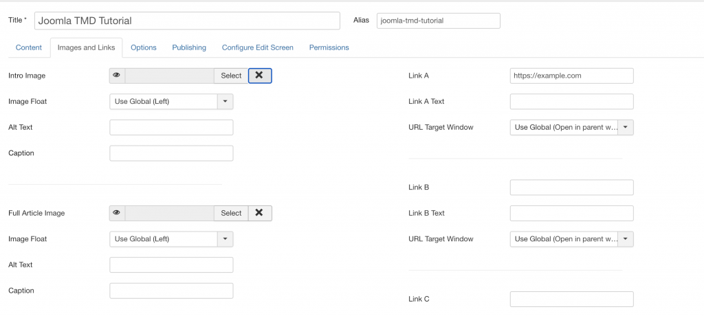 1.1. On the left side, you can set the Article Title and Alias, which is added as an additional SEO improvement. You can let Joomla auto-fill the Alias, by using the Article Name strings. An example of how Joomla auto-fills an Article Alias: