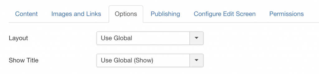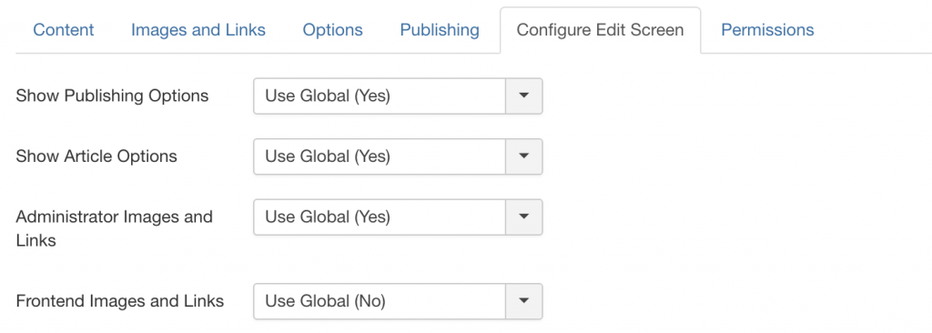 These settings apply to the users who have been granted privileges to write and edit Articles. As mentioned earlier, options can be manually set, or the Global settings can be changed from Admin Panel -> Content -> Articles -> Options.