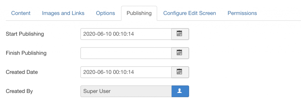 The “Publishing” tab will let you manually set an Article’s publishing date, author, in case it is is set to be displayed.