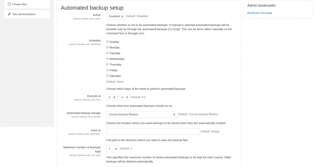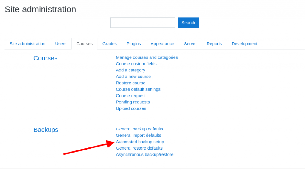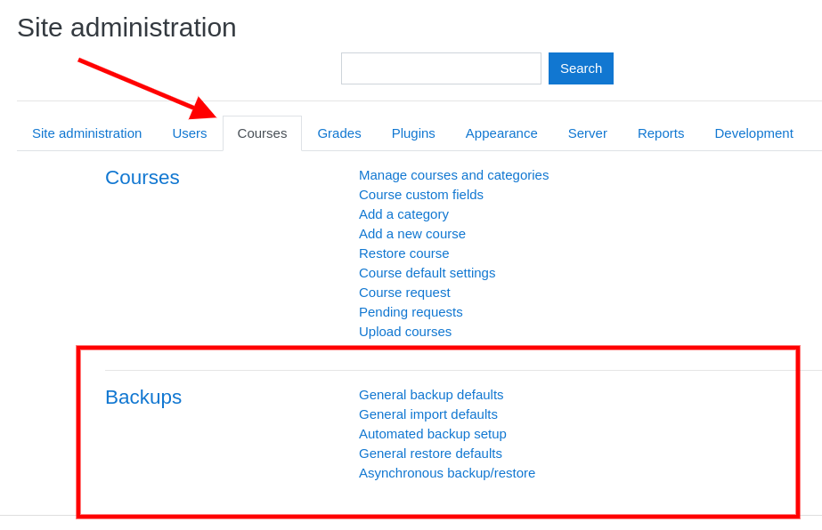 From there you should navigate to the Courses tab where you will be provided with several options for the backup service of the Moodle application.