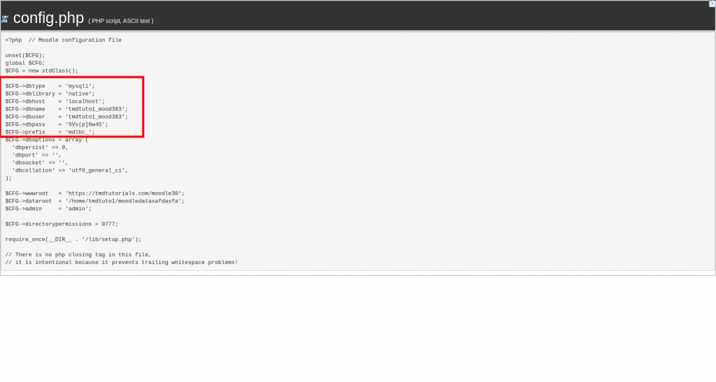 Once you have selected the “View” option you will be presented with the configuration information of your Moodle application and the database with which your Moodle application is configured.
