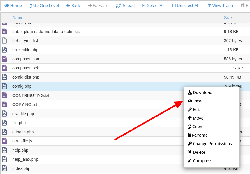 Access the File Manager tool and navigate to the document root of your Moodle application. Once there right click on “config.php” file and click on “View”.