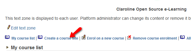 In order to create a new course on Claroline you should fist login via the home page. Logged with the administrative username and password you will be provided with several options on the bottom of your home page. Please click on the Create a course site link to proceed with the creation process.