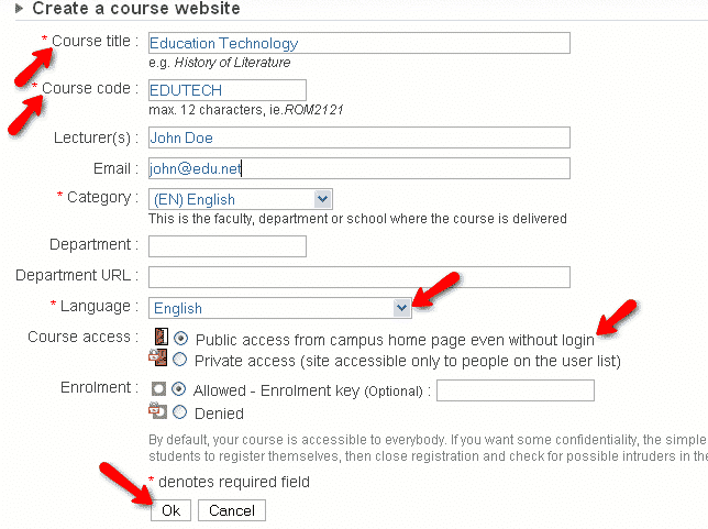 On the next page you should set your Course title, the unique course code as well as select your course category and language. You can also choose if your course will be public accessible or it will be available only for users in the user list.