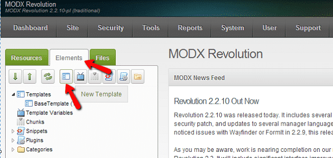 In MODx you have been provided with the opportunity to create your own template. To create new template in MODx login to your site’s administrative area. To create a new template, use the left side menu and click on Elements > New Template: