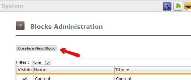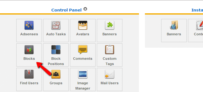 When you login to the admin area, click on the “Blocks” icon as shown in the picture: