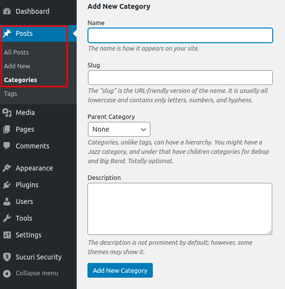 In order to create a new post category go to your admin area → Posts→ Categories: