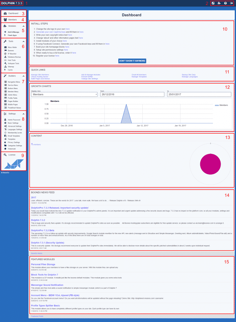 2 – In this section the Boonex developers have placed several quick links that you would most probably use in your everyday work. The first one on the left leads to the frontend of your website. The second one leads to the official Boonex Market from where you can get modules, templates and other extensions for your website. Next comes the link to the official documentation for the script. The last one allow you to leave the administration area.