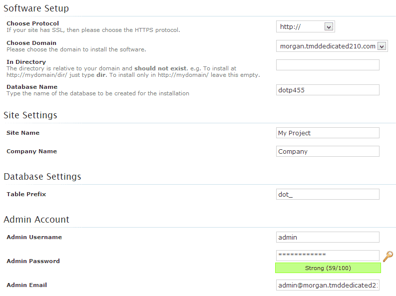 Click the “Install” button when you have entered all the required information and wait for Softaculous to finish the installation. You will be provided with the URLs for your dotProject website once the install is complete.
