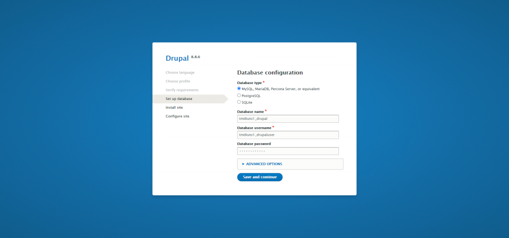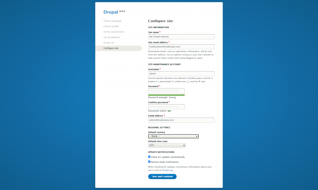 - Site name – the name that you would wish to use for your Drupal website.