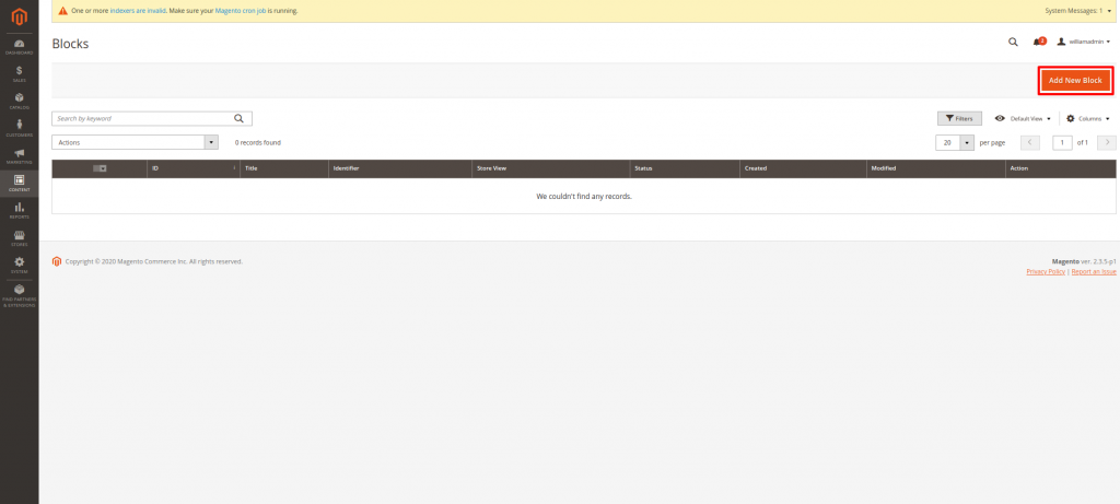 You will be directed to a new Page, where you will see all of the available CMS Blocks, which by default should be completely empty. In order to create a Footer Links Block you would need to click on the “Add New Block” Button on the top right corner of the page: