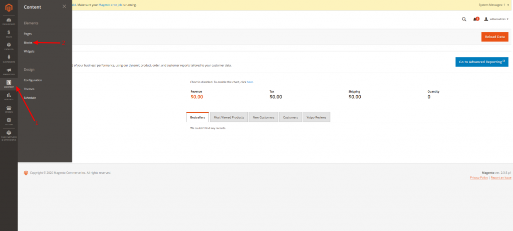 The first step would be to access the Admin Area Dashboard of your Magento Application. After that navigate to Content (1) > Blocks (2) as you can verify from the following screenshot: