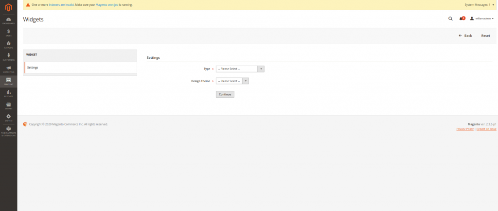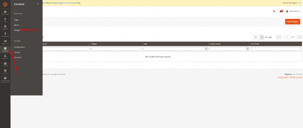 Once done, you would need to create the Footer Link Widget by navigating to Content (1) > Widgets (2), as in the following screenshot: