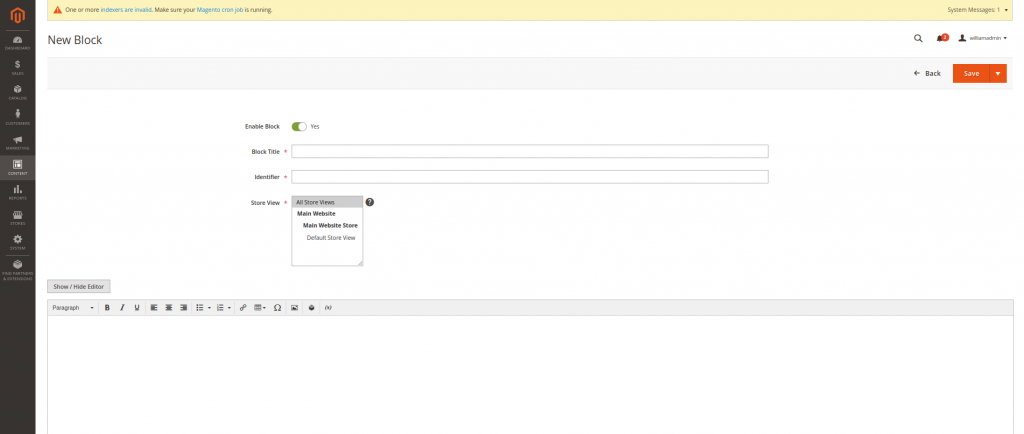 - Assign to Store Views: All Store Views (Or in case you are running a Magento Multistore Installation, the corresponding Store that you wish to add the CMS Block to)