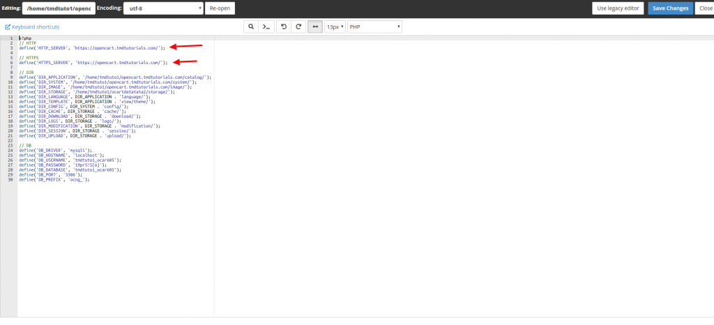 define(‘HTTP_SERVER’, ‘https://opencart.tmdtutorials.com/’);