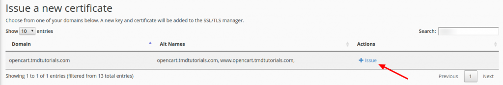 Once there click on the issue button for the domain on which you have installed OpenCart