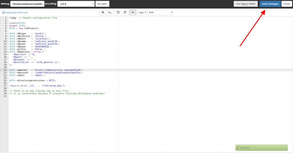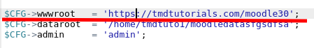 On this page you should change the line of code “$CFG->wwwroot”. As you could see currently the domain is configured to load via HTTP protocol which is not secure. To configure your Moodle application to load via HTTPS protocol you should change the URL from which is loading your domain to include HTTPS as follow: