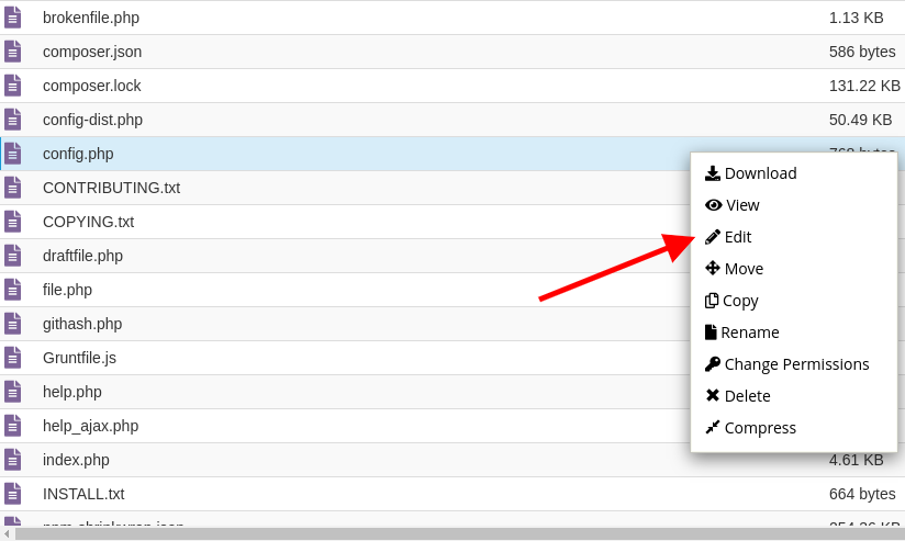 Once you have opened the File Manager tool navigate to your Moodle application document root and open the config.php file with a Text Editor: