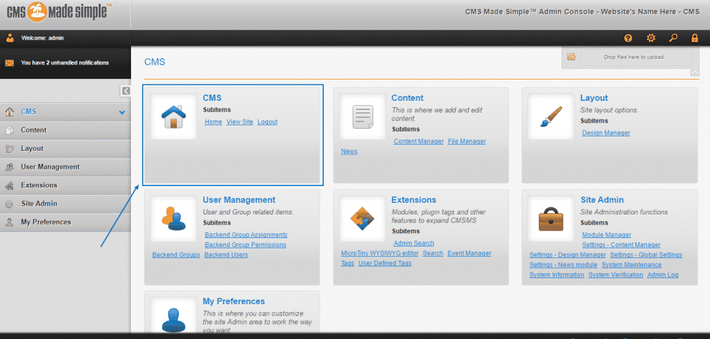 First of all, you need to login into your Administration Panel. Then you will see all the seven main menus, mentioned above, not only in boxes in the middle of the screen, but also as options with drop-down menus at the left side of the screen. In the first one – CMS, you will see that you will be able to redirect to the default administration area page, by clicking on Home, to view your website’s frontend or to simply Logout: