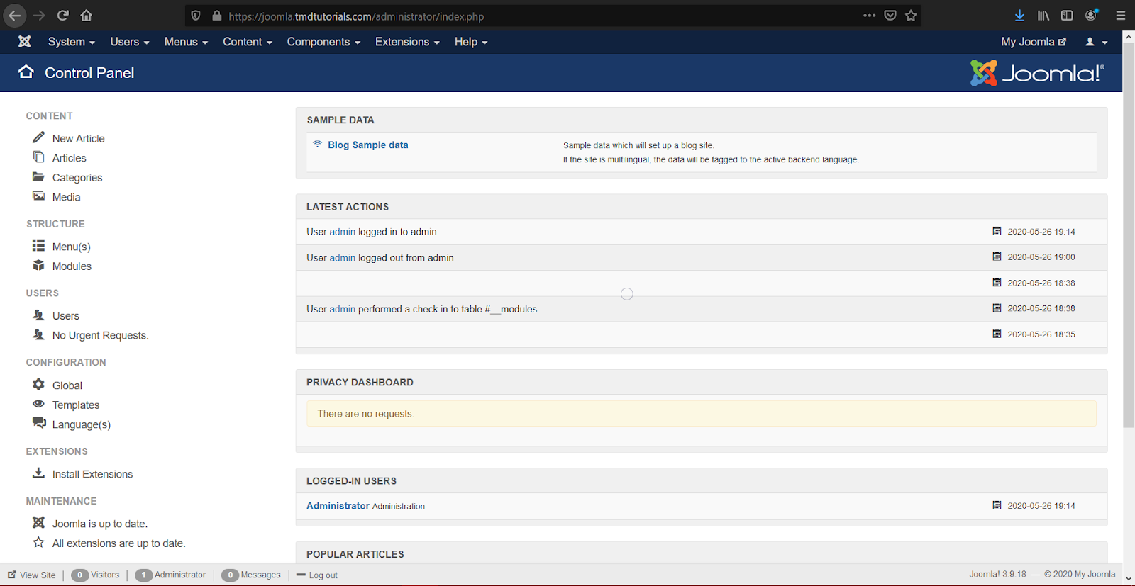 If you have entered the correct Username and Password, you will be redirected to the homepage of your Joomla’s dashboard.