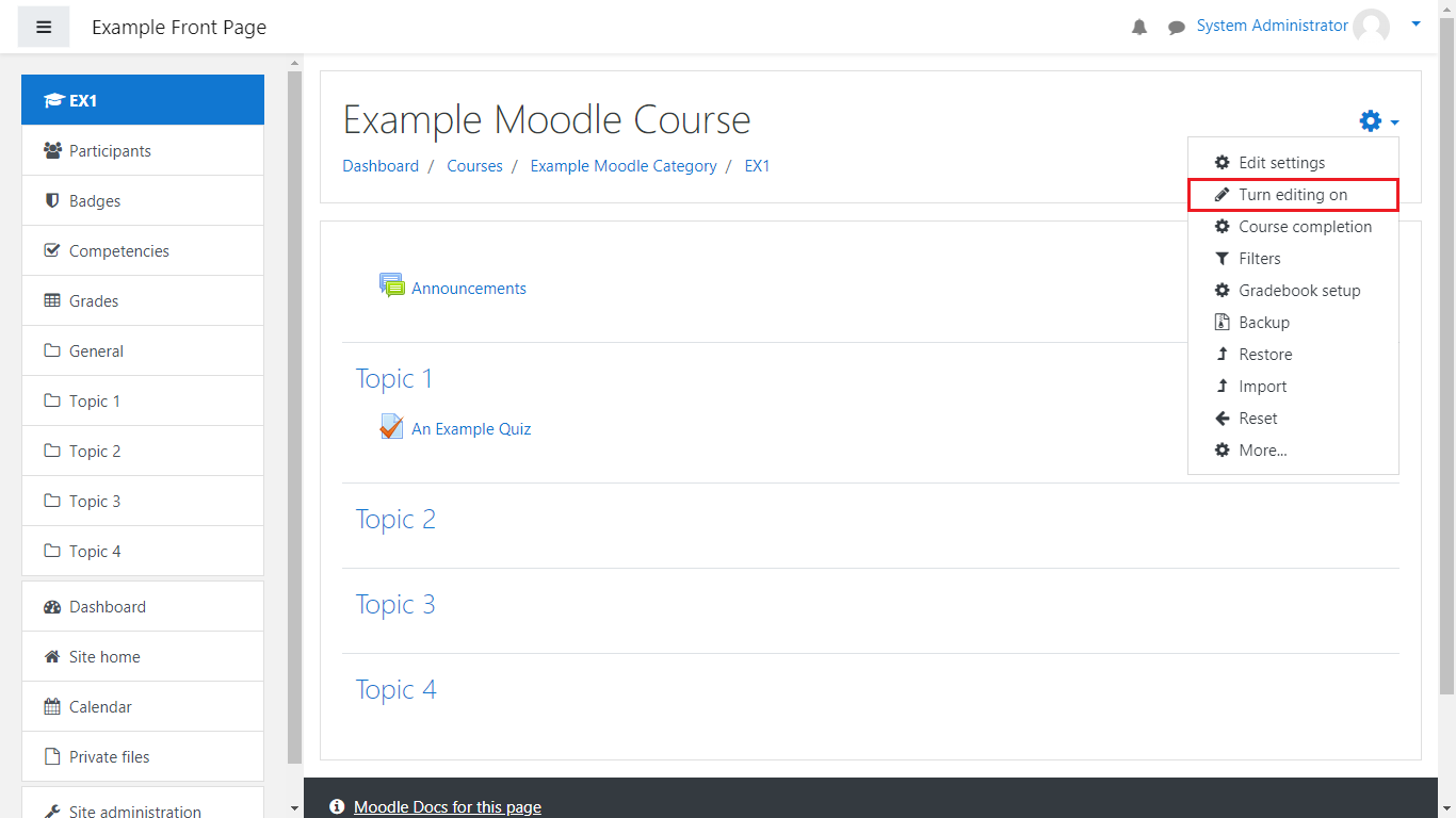 Next, enable editing by clicking on the Cog button and selecting Turn editing on: