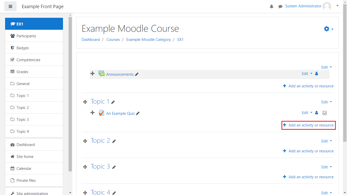 Once enabled, click on the +Add activity or resource button:
