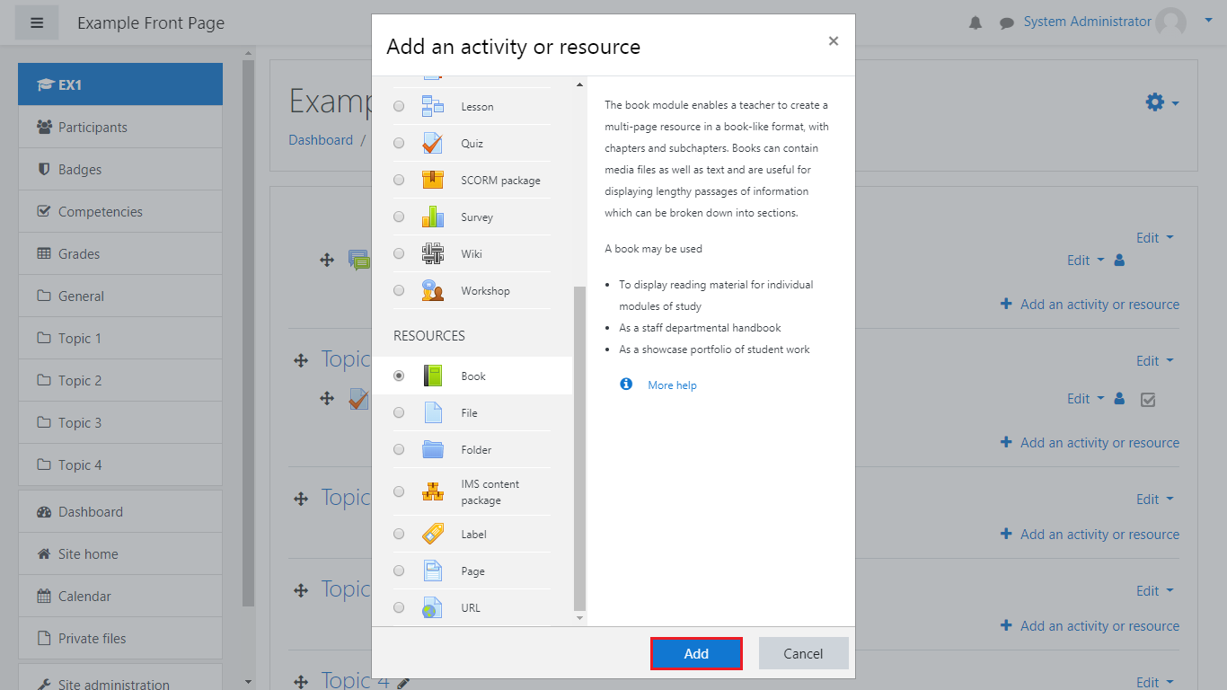 A pop-up window will appear, scroll down and locate the Resources category. Select the type of resource you would like to add(In this scenario we added a book) and click on Add:
