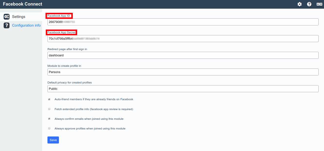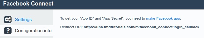 Before continuing the configuration and activating the app you will need to create an account in https://developers.facebook.com/ to generate "App ID" and "App Secret". Additional information and is present in the “Configuration info” menu when the app is accessed. The “Redirect URL” has to be configured in the Developers Facebook – Facebook Login – Settings. The address has to be placed in the “Valid OAuth Redirect URIs” field.