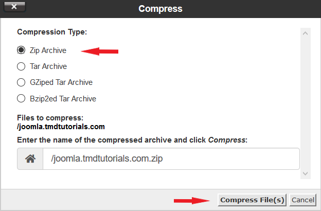 After clicking “Compress” you will be asked what type of compression you want to use. You may select the “Zip Archive” as it is universal, and is recognized by most operating systems. Once the compression type is selected, click “Compress File(s)”.