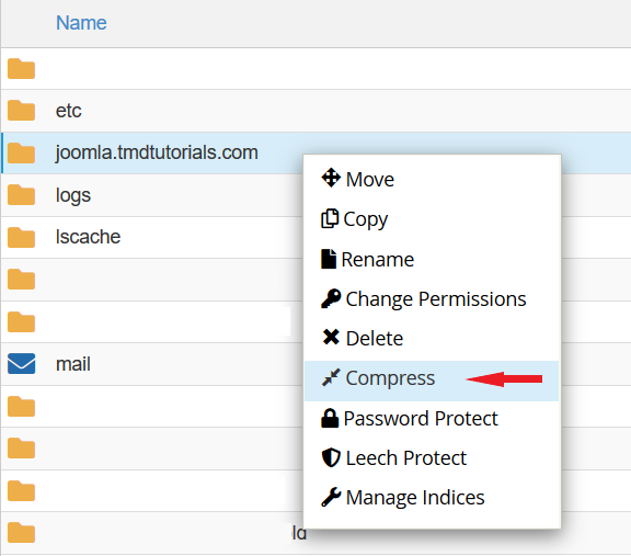 Once you are in the “File Manager” right click on the root folder for your Joomla website and click “Compress”.