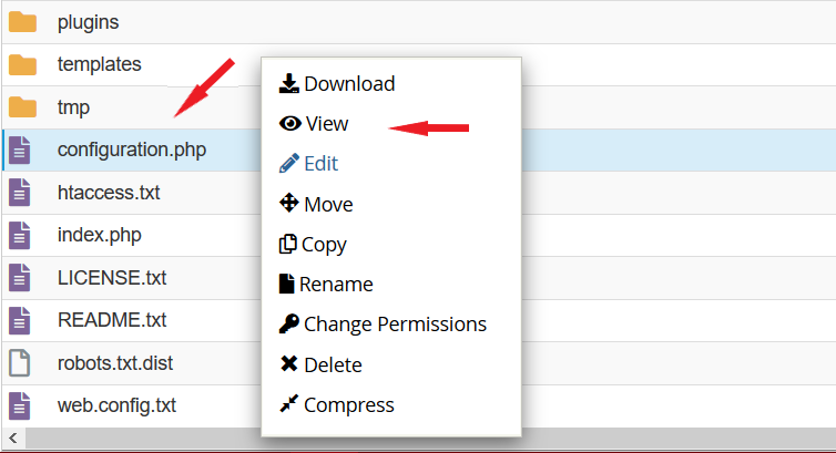 Let’s start by getting a backup of the website’s database. In case you are not sure which one is the correct database for your Joomla website you may check it in the “configuration.php” file located in the root directory of your website. You may find it by using the “File Manager” tool in your cPanel.