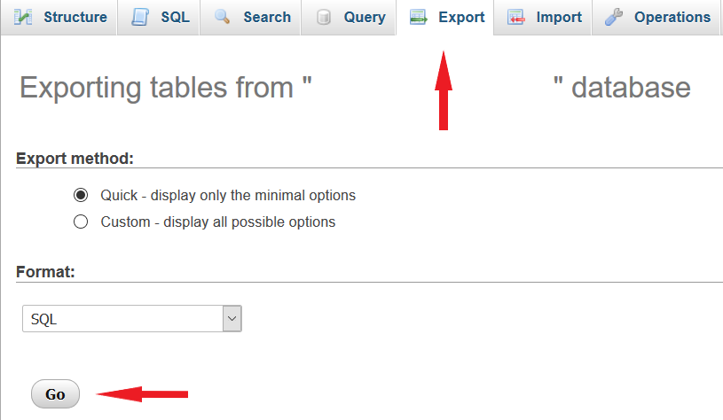 Now click the “Export” button on top of the page, and click “Go”. This will download the SQL file of the database on your device.