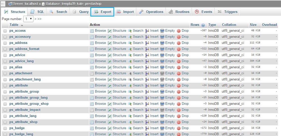This will lead you to all of the databases located in your cPanel account. If you are not sure of the name of the database which your Prestashop website uses – refer to the file named setting.inc.php, located in the config folder in the website’s directory.