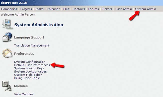 The dotProject comes with three pre-installed themes that you can choose from. To change the site theme, login to the admin area and click on “System Admin” and select “Default User Preferences”: