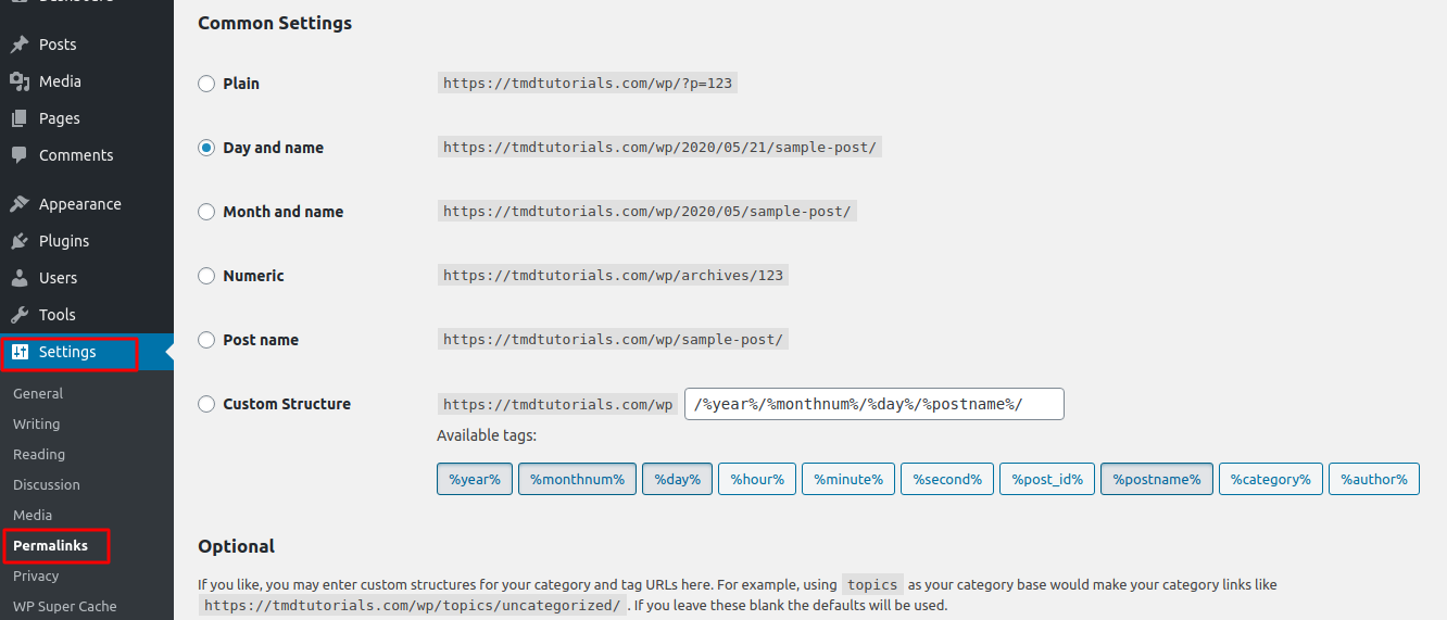 - Custom Structure: The last option are the custom permalinks. When you choose custom structure you can build the permalinks from the tags below