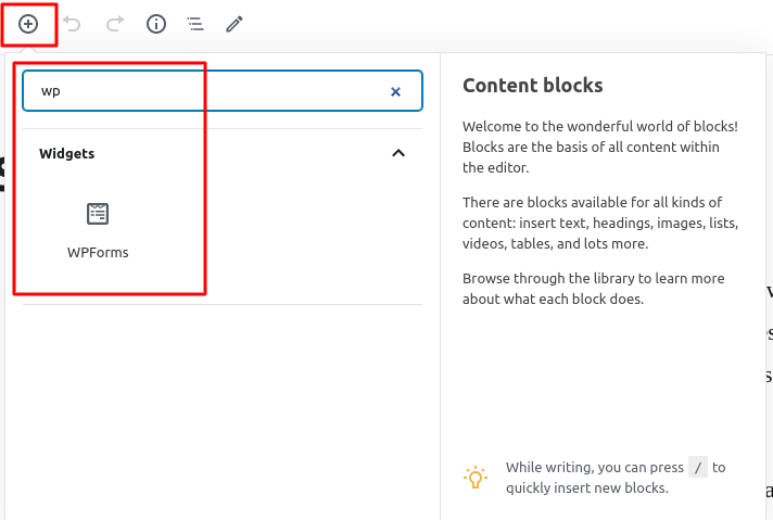 Once in the edit mode click on the line where the form will reside. At the top left corner you will see the plus button as shown in the image above. This will open a window in which you have to find the WPForms widget and click on it. After that just choose the form which you recently created and it will display on the page. Click on “Publish” so the changes can reflect on your website and you are ready.