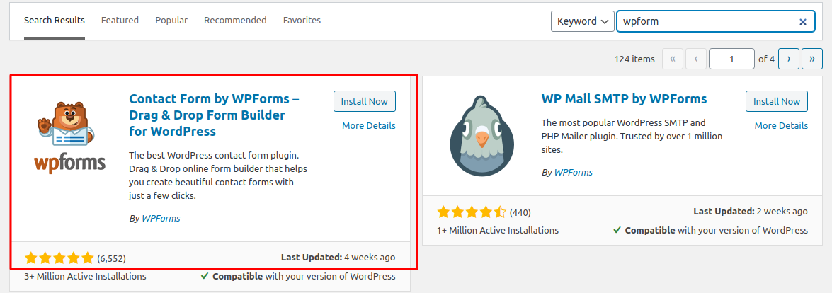The first step is to access the admin area of your website and go to Plugins → Add New. Type WPForms in the search bar: