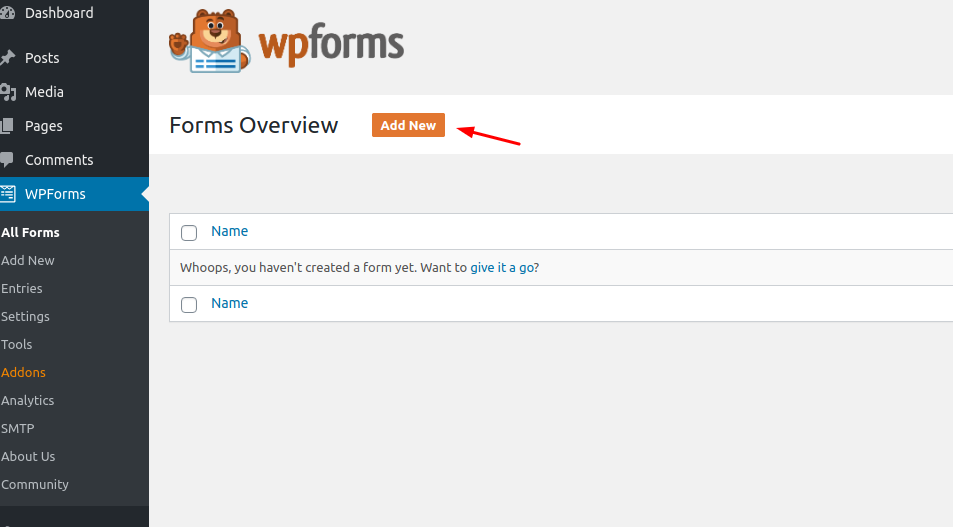 Click on “Install Now” and then Activate the plugin. After that a new menu will show up on the left “WPForms”. Click on the newly created menu and then “Add New”: