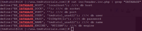 After creating a backup of the files we can proceed with exporting a backup of the database that the UNA application is using. To check which is the exact database that the application is using you will have to navigate to “/home/una-root/inc/” and view the “header.inc.php” file. In this file, you will find information about the Database Name, Database User, and Database password.