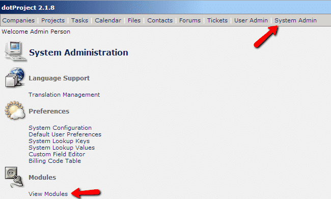 dotProject comes with plenty of pre-installed modules. To enable or disable these modules, login to your dotProject website and click on “System Admin” and select “View Modules”: