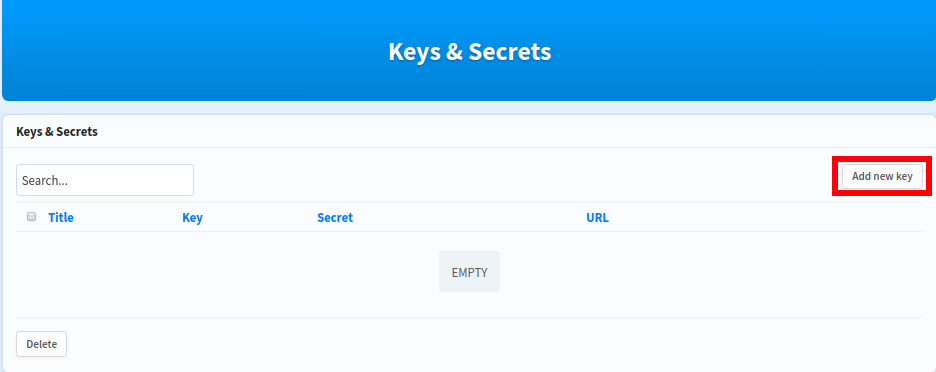 This will lead you to the “Keys & Secrets” menu from where a new key can be added using the “Add new key” button as shown below: