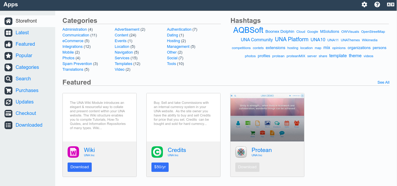 Now you will be able to install new apps, tools, templates, etc. to improve the functionality, appearance of your UNA Website: