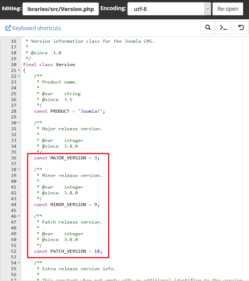 If however, the version of your Joomla website is lower than 3.8.x, then the version.php file will be located in the root folder of your Joomla website → libraries → cms → version.