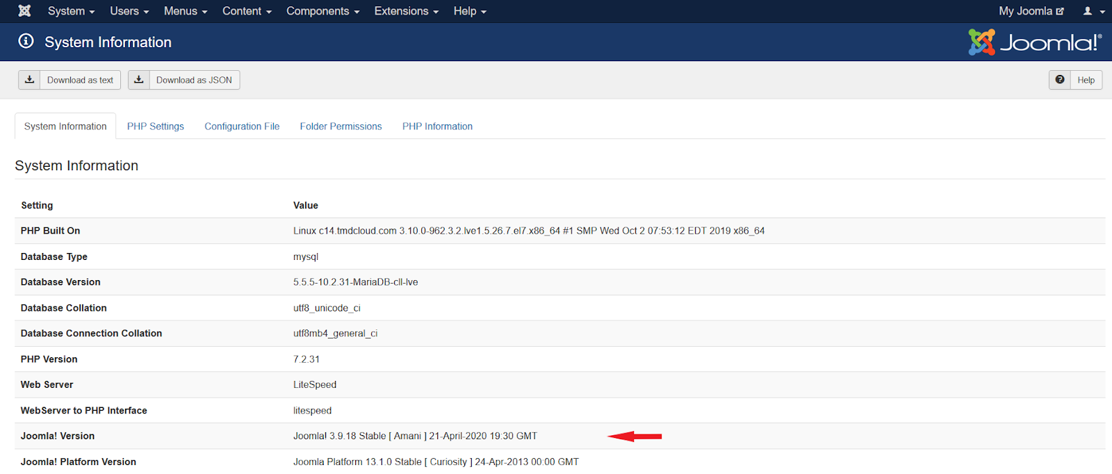 Once logged into your Joomla dashboard, select “System” from the menu on the top of your screen and click “System Information” from the drop-down. The System Information page contains all the information you may need for the Joomla version currently running, as well as the server type, PHP and database versions, etc.
